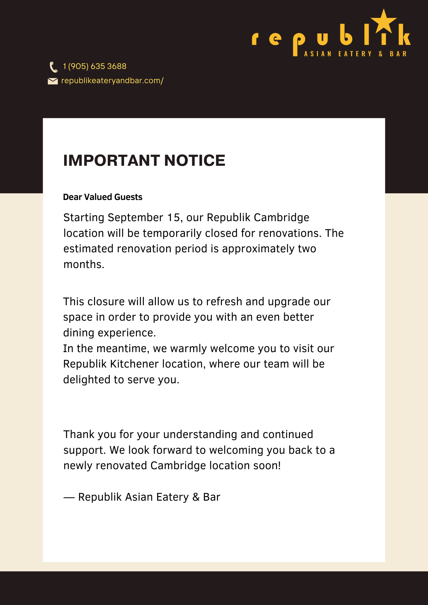 Republik Asian Eatery and Bar, the ultimate destination for a unique dining and entertainment experience, now has three locations in Cambridge, Kitchener, and Windsor, Ontario. We are thrilled to introduce a groundbreaking concept to these areas, merging the best of Asian cuisine, a trendy kitchen bar atmosphere, and the vibrant energy of a weekend club, all under one roof.